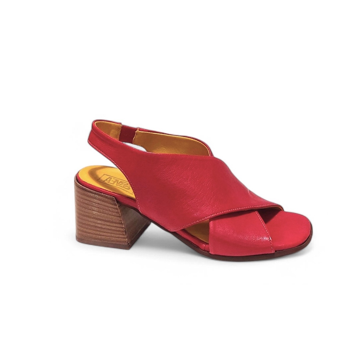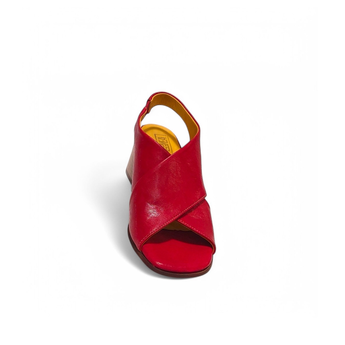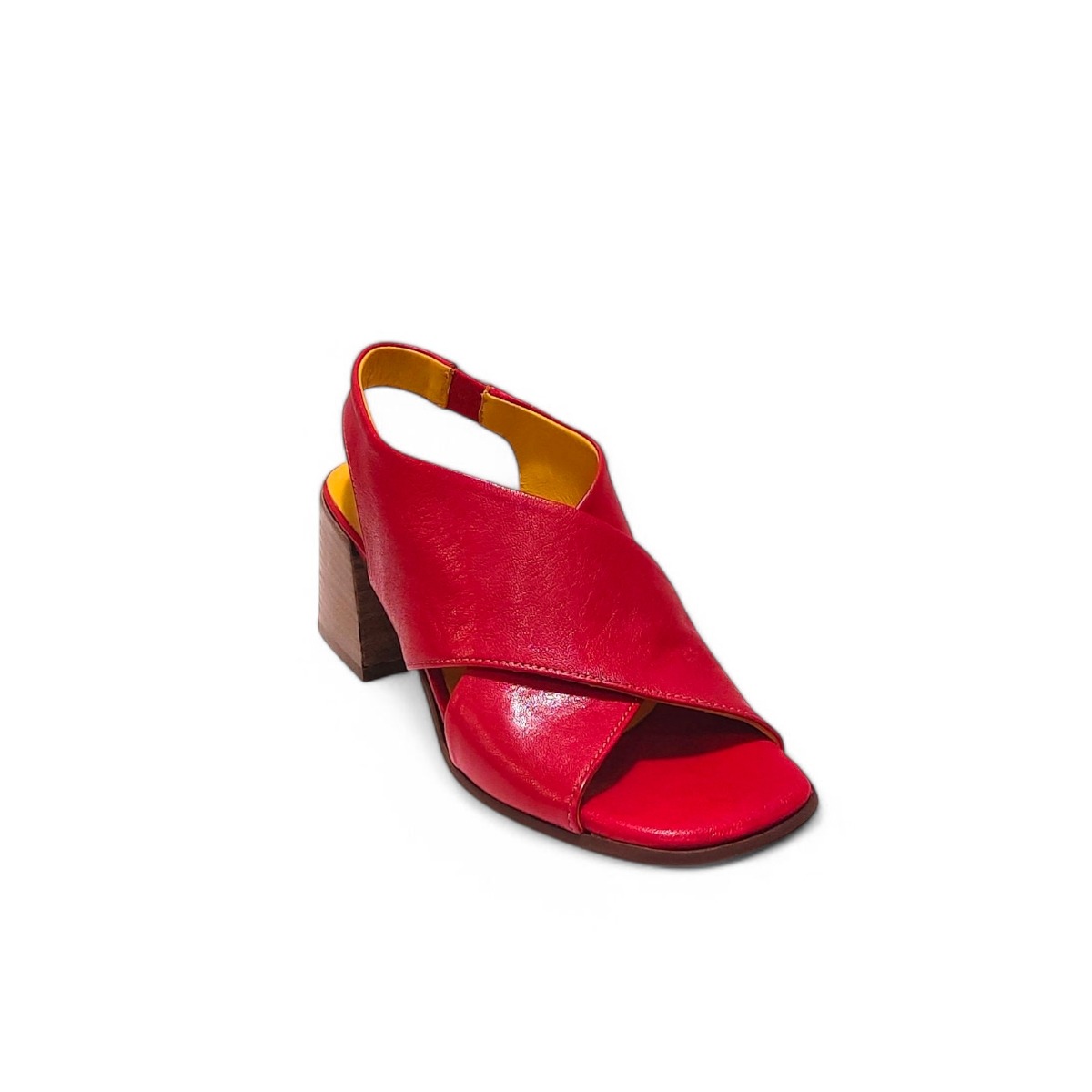 Il design incrociato conferisce a questo sandalo un tocco di modernità, mentre il tacco di 5 cm assicura una postura elegante e slanciata, ideale per ogni silhouette. Gli accenti artigianali rendono questo sandalo unico, arricchendo il tuo guardaroba con un accessorio esclusivo.