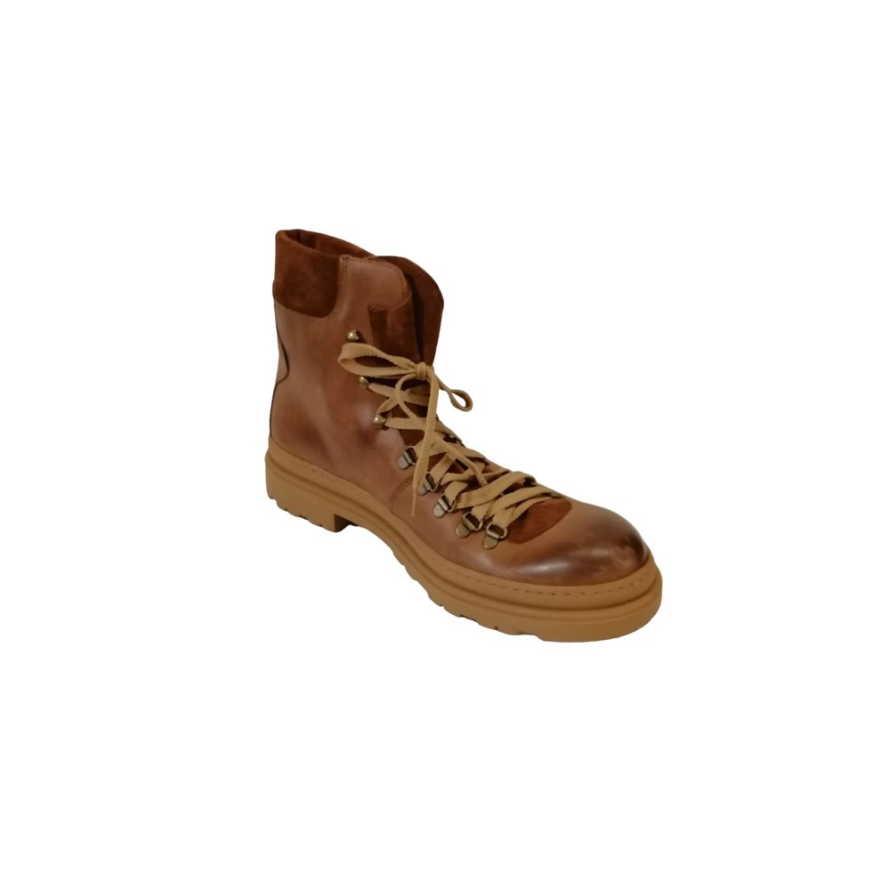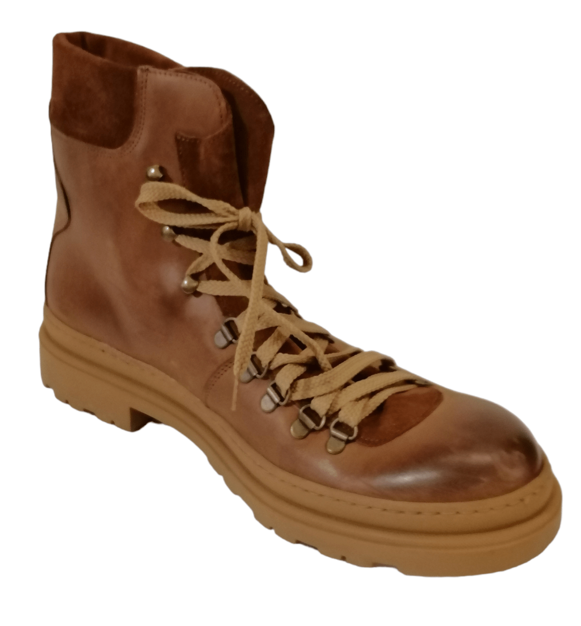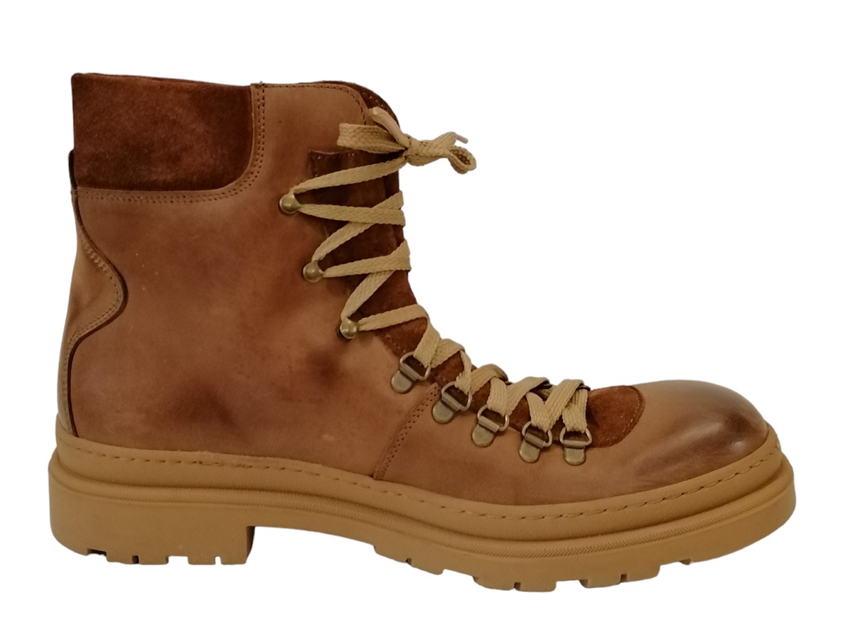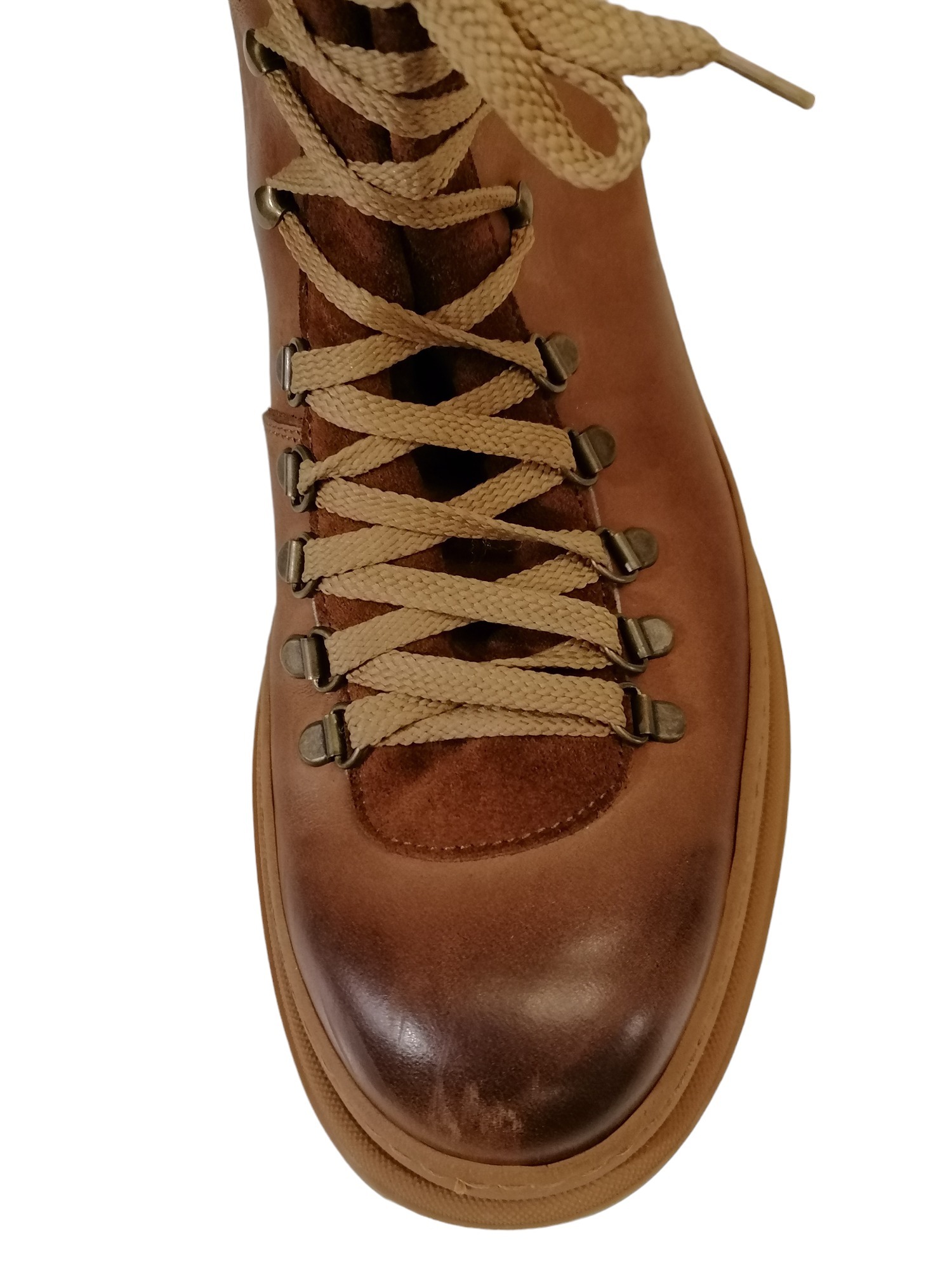 Spiritoso scarponcino in pelle conciata al vegetale e suola in gomma. Ampi occhielli completano questo modello monkey boots giovanile e sportivo.
